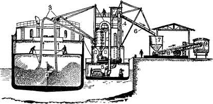 Разгрузка зернососом. 1 — плавучий зерносос; 2 — трюм судна; 3 — всасывающие трубы; 4 — зерноподъемник; 5 — воздушный насос; 6 — подающая труба; 7 — бункер; 8 — ленточный транспортер; 9 — вагон.