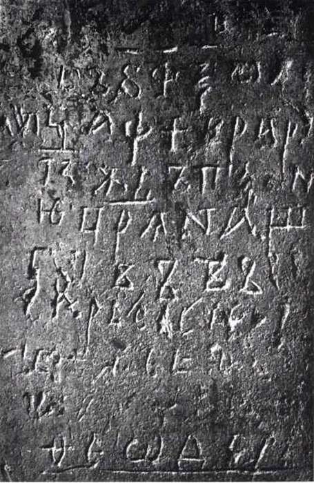 Особливий інтерес становить так звана “Софійська азбука”, виявлена С.О. Висоцьким на стіні Михайлівського вівтаря Софійського собору в Києві. Вона складалась із 27 літер: 23 — грецьких і 4 — слов’янських: Б, Ж, Ш, Щ. Найпростіше пояснення знахідки — перед нами невдала спроба відтворити кириличний алфавіт, до якого схиляються деякі вчені, — не може вважатися обґрунтованим. Хоча накреслення букв аналогічні кирилиці, але це не кириличний алфавіт, який складається із 43 літер. Не може він вважатись і азбукою із 38 букв, про яку говорить Чорноризець Храбр. Згідно з С.О. Висоцьким, “Софійська азбука” відображає один із перехідних етапів східнослов’янської писемності, коли до грецького алфавіту почали додавати букви для передачі фонетичних особливостей слов’янської мови[656]. Ймовірно, що перед нами алфавіт, яким користувалися на Русі ще в часи Аскольда і Діра.