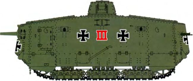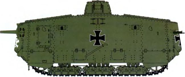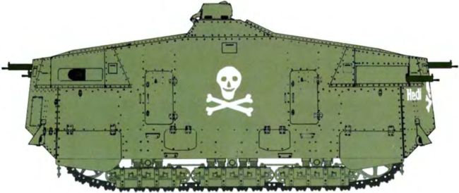 Танк A7V № 507 из состава 3-го «штурмового отделения», апрель 1918 г. Танк оснащен «козловой» орудийной установкой и несет монохромную защитную окраску типа «фельдграу».