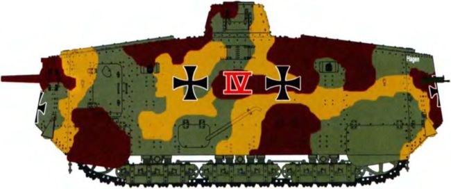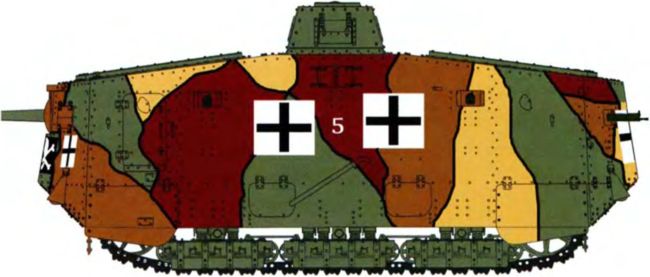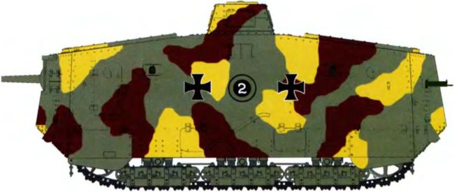 Танк А7V № 540 из состава 1-го «штурмового отделения», сентябрь 1918 г. Камуфляжная окраска нанесена поверх типового «фельдграу».
