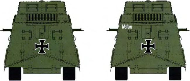 Лобовая часть A7V из первого заказа, с тумбовой установкой орудия. Вариант монохромной окраски типа «фельдграу» (слева).