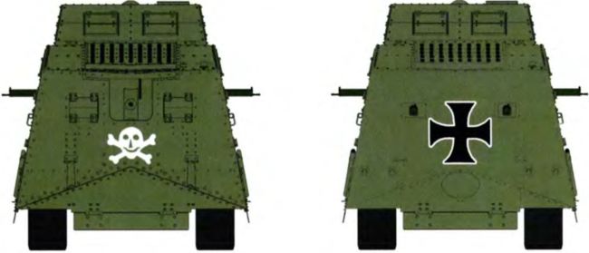 Вариант монохромной окраски танка A7V 1-го «штурмового отделения», апрель 1918 г. Лобовая часть корпуса с тумбовой установкой орудия. Рубка управления танка — с установкой компаса и дополнительным бронированием (слева).