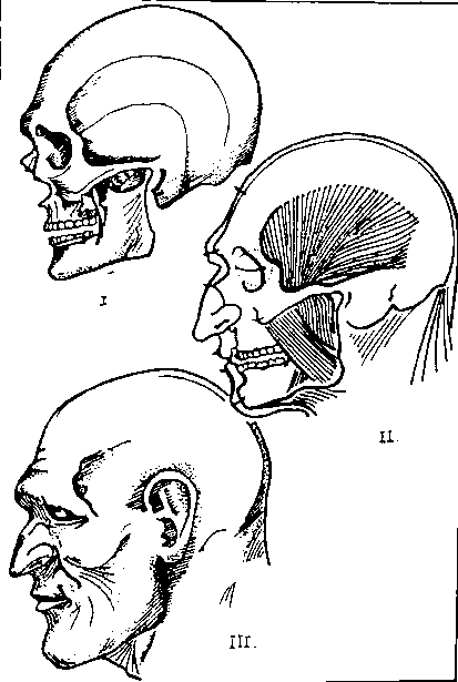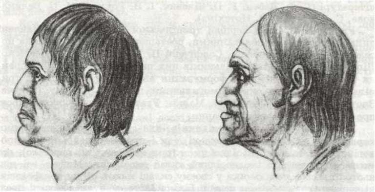 Рис. 152. Голови чоловіків із поселення трипільської культури. Незвисько. Реконструкція М. М. Герасимова.