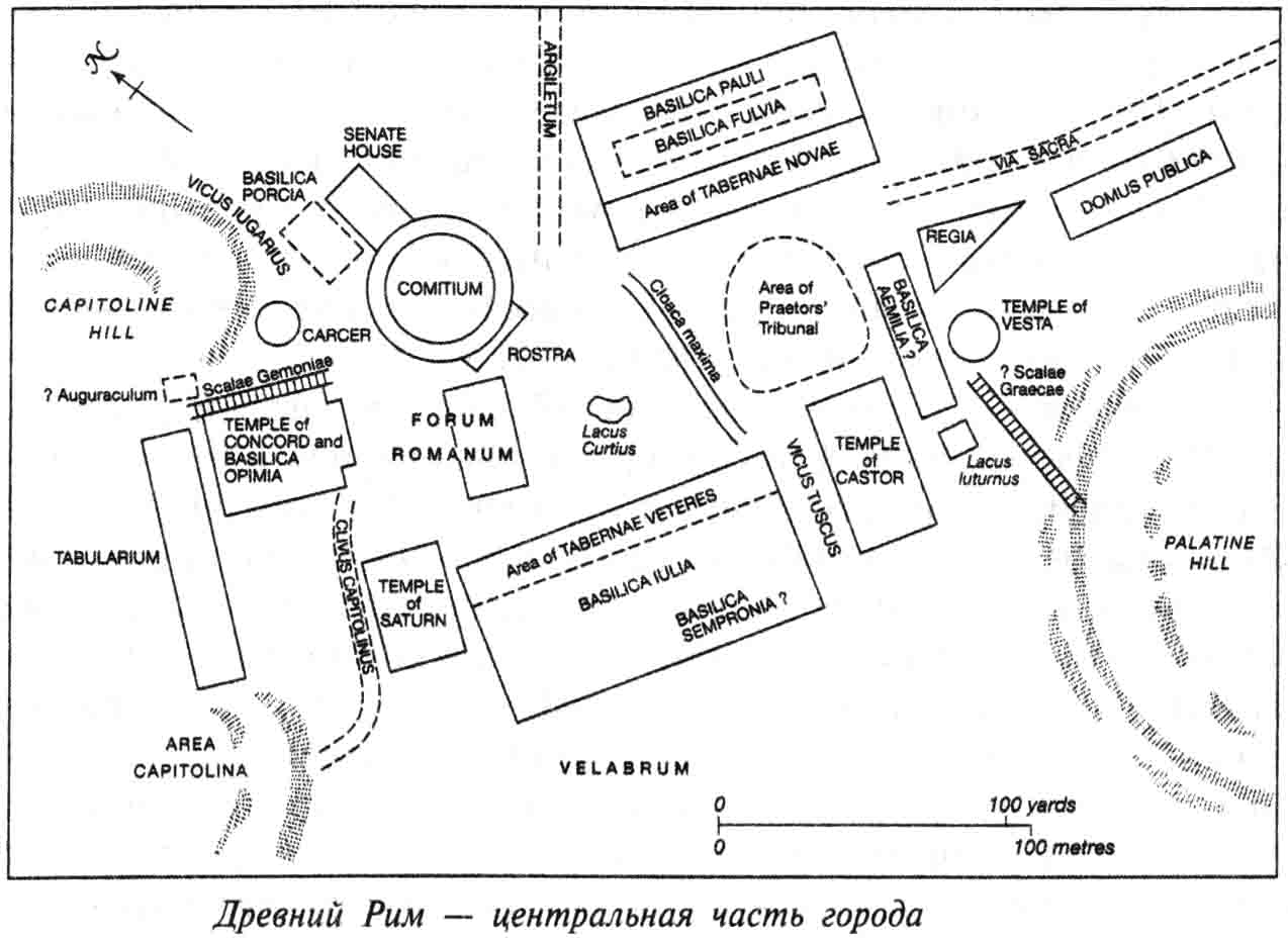 Хотя Римская республика в конце II века до н. э. стала великой средиземноморской державой, сам город Рим оставался безусловным центром политической жизни. Там и только там собирались сенаторы, заседали суды и проводились народные собрания для выборов магистратов или издания законов. К 100 г. до н. э. Рим был крупнейшим городом в известном мире, далеко опережавшим даже ближайших соперников, таких как Александрия. К концу I века до н. э. численность его населения колебалась около миллионной отметки, и даже в 100 г. до н. э. там жило не менее 700 000 человек. У нас не хватает данных для более точной оценки, но даже эти цифры дают некоторое представление о величии города. Впрочем, несмотря на многолюдность, в ту эпоху, когда самым быстрым средством передвижения была лошадь, Рим заметно уступал по площади более современным городам. Застройка, особенно в бедных кварталах, была чрезвычайно плотной, однако в самом центре Рима находилось открытое пространство форума. Это был центр торговли, где стояли модные магазины, граничившие с величественными зданиями и предлагавшие предметы роскоши, составлявшие гордость империи. Здесь встречались представители больших торговых компаний и поставщики зерна. Но он также был центр законодательства и правосудия, здесь заседали суды, адвокаты представляли свои аргументы, а присяжные выносили вердикты на виду у всех.