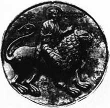Интересно то, что в Грузии, в монастыре Гелати, был найден старинный серебряный диск с изображением святого Мамая верхом на льве. Возможно, казак Мамай закончил там свою жизнь послушником, как это практиковалось у запорожских казаков, и велел изобразить себя на льве, символическом перевозчике души воина на тот свет. Такие изображения воинов на львах известны у нас еще с сарматских времен, хотя культ льва существовал гораздо раньше. Еще древние трипольцы имели изображение девы-льва (247, І, 51). Археологами найдены золотые сколотские пластинки, где изображено как введение юноши в специальный транс перед этим поединком, так и сам поединок со львом. Лев был эмблемой-тотемом скифских царей, о чем свидетельствуют многочисленные изображения львов на гривнах, подвесках, золотых бляшках и мотивы борьбы с ними скифского царя — прапредка Таргитая. Образ царя в шлеме в виде львиной головы был отчеканен на монете скифского царя Атея. Греческий писатель Лукиан из Самосаты в одном из своих произведений приводит рассказ скифского мудреца Токсарид о том, как скиф по имени Белитт (Велит), не щадя своей жизни спасал своего собрата, когда на того напал лев: «Однажды во время охоты он увидел, что лев стащил с коня его друга Баста и подмяв под себя его вцепился в горло и начал разрывать когтями. Белитт соскочил с коня, бросился сзади на льва, схватил руками, желая привлечь его внимание на себя, и засунул в пасть свои пальцы, пытаясь, как можно, спасти Баста от зверя. Наконец лев бросил того уже полумертвым, повернулся к Белитту и убил его. Белитт, умирая, успел однако, ударить льва мечом в грудь, так что все трое умерли одновременно. Мы их похоронили в двух курганах, насыпанных рядом: в одном — друзей, во втором, напротив, — льва» (195, 147). Значит в Скифии водились львы и существовал их культ, ведь они насыпали над львом отдельный курган.