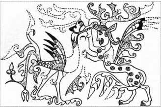 Далеко от Украины, на Алтае, в т. н. Пазырыкских курганах, сохранились курганы скифских царей, ведь скифские племена в древности доходили аж до Алтая. В вечной мерзлоте тела царей сохранились полностью, чего не скажешь о наших курганы. На них найдены татуировки в знаменитом скифском зверином стиле. Интересно, что у скифских царей была особая привилегия: только они имели право накалывать татуировкой львиную голову в области сердца. Жаль, что не знаем точно, не могла ли быть и над сердцем князя Льва Даниловича Галицкого такая же татуировка. В одном из Пазырыкских курганов обнаружены войлочное настенное полотнище с чрезвычайно интересной батальной сценой. На нем изображен крылатый рогатый воин с человеческим лицом и телом льва, вступивший в единоборство с огромной птицей (грифоном). Но самое интересное, что на человеческой голове этого воина-льва изображены лихие казацкие усы и длинный чуб, который со лба спадает на затылок. Отголосок этого мифа сохранился в украинских колядках о принце Иванке, который гонится за странным зверем туром-оленем, ловит его и тот дарит ему свои рога (221, 25).