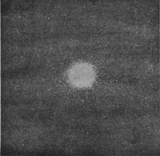 Оно принадлежит к самым красивым звездным скоплениям. В самом деле, в хороший телескоп это звездное скопление представляет из себя чудесное зрелище. Мы видим здесь кучу Солнц, выделяющуюся в глубокой бездне неба, как полная горсть сверкающих бриллиантов. Изображенное на этом рисунке (см. рис. 7) звездное скопление имеет около центра сильное скопление отдельных звезд. Здесь отчетливо видно, как первоначально единый туманный шар прежде всего уплотнился около центра всей своей массы, образуя вместе с тем по краям отдельные звезды.