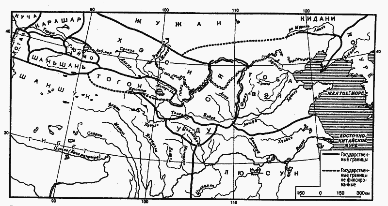 Еще более важным событием был переворот в китайском городе Гаочане, расположенном в Турфанской впадине. Китаец Гань Шуан захватил власть в городе, отказал в подчинении князю Хэси и попытался завязать сношения с Тоба Дао, однако жужани перехватили табгачское посольство и только после долгих переговоров отпустили пленников домой[870]. В 437 г. другое табгачское посольство сумело добраться через долину Тарима в Среднюю Азию. Оно было прекрасно принято в Фергане и Чаче (Ташкенте). Оседлые владетели оазисов подтвердили свое желание торговать с Китаем[871]. Для них не имело значения то, что династия была кочевнической; они хотели наживы, как всякие истые купцы. Тоба Дао тоже решил восстановить сношения с Западом. Причина этого проста: в это самое время Хэси, Тогон и Жужань заключили союз против растущей агрессии империи Тоба-Вэй.