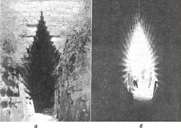Рис. 55. Пантикапей. Царський курган. Реставрований вхід до дромосу: а — вигляд ззовні; б — вигляд зсередини.