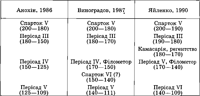 Далі протягом II ст. до н. е. правили різні царі, про яких ми маємо ще менше відомостей. Дослідники більш-менш одностайно поділяють думку, що на початку цього століття царював Спарток V. З датованих епіграфічних пам'яток відомо, що в 178—176 рр. до н. е. Камасарія і Перісад III зробили присвяти в Дідімейон поблизу Мілета, а дельфійський декрет на їх шану відноситься до часу близько 170 р. до н. е.[674]. Керуючись такими хронологічними межами, дослідники історії Боспору визначили різні, наведені в таблиці, періодизації їх правління[675].