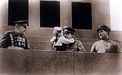 Маленков, Сталин с девочкой Верой, Булганин на трибуне Мавзолея. Москва, 1952 г.