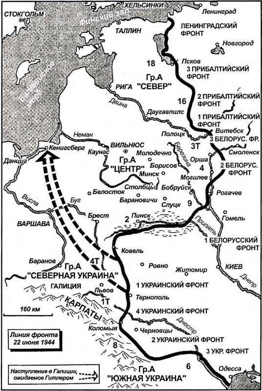 Восемнадцать месяцев Гитлер отказывался признать, что Сталин совершенно очевидно стремится подавить южное крыло. Восемнадцать месяцев он недооценивал Красную Армию и ее растущий военный опыт. Теперь он совершал новую ошибку. Он верил, что Сталин может искать решения только на юге — просто потому, что в Галиции у него появляется стратегическая возможность наступать на Варшаву и Вислу и таким образом в тыл группы армий «Центр». Гитлер отбросил все сомнения: русские, сказал он, ударят между болотами Припяти и Карпатами! Они должны ударить там!