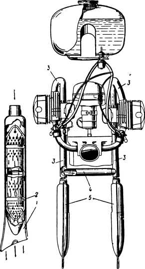 Рис. 51. Система выпуска двигателя мотоцикла М-72: 1 — наконечник глушителя; 2 — сердцевина глушителя; 3 — выпускные трубы; 4 — соединительная труба; 5 — глушители.
