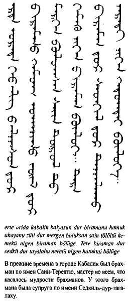 Рис. 171. Монгольский текст. (В прежние времена в городе Кабалик был брахман по имен Саин-Терелтю, мастер во всем, что касалось мудрости брахманов. У этого брахмана была супруга по имени Седкиль-дур-тагалаху.).