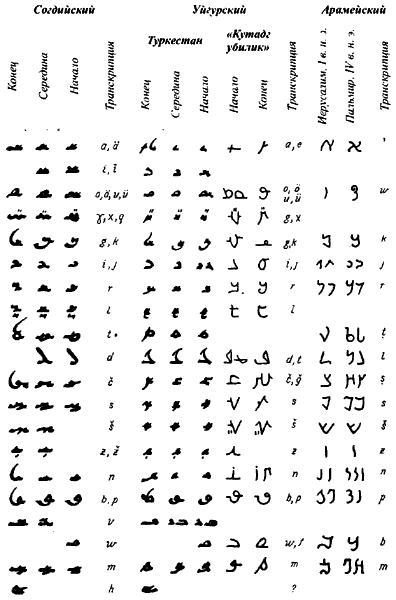 [Знаки тюркского письма обозначают, скорее, гласные и согласные, но формы знаков для некоторых согласных зависят от того, стоит ли перед ними велярный гласный (а, о, u, i) или же палатальный (е, а, о, u, i). В транскрипции обозначает d после велярного гласного, — d после палатального. Благодаря такому точному обозначению окраски согласного появляется возможность особо не обозначать соседние гласные внутри слова, а также иногда и гласные в исходе слова, тем более что словоделение не всегда строго соблюдается. В вопросе о происхождении тюркского рунического письма вначале господствовали ошибочные мнения: это письмо пытались сопоставлять с индийским письмом кхароштхи, с южноаравийской письменностью и даже с германскими рунами. Только когда был установлен по письмам II в. н. э. древнейший облик согдийского письма, источник тюркского рунического письма был найден в согдийском. Очевидно, около 800 г. древнетюркское письмо было полностью вытеснено уйгурским; последний его памятник — орхонская надпись 784 г.]