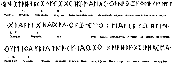 Франц Бабингер никак не мог взять в толк, каким образом эти — рунические — письмена попали в Стамбул, и отослал фотокопию прославленному дешифровщику древнетюркских рун Вильгельму Томсену в Копенгаген. Томсен в свою очередь опознал в копии так называемую гунно-скифскую надпись на венгерском языке. Ему удалось отгадать несколько слов и приблизительный смысл надписи, а уж сам Бабингер в содружестве с венгерским исследователем И. Шебестиеном завершил дешифровку и прочел надпись. Текст ее проливает яркий свет на одно историческое событие, хорошо известное из древних венгерских хроник и связанное с судьбой посольства, которое богемский король Ладислав II, правивший с 1490 по 1516 год также и Венгрией, послал ко двору султана Селима (1512–1520). Посольство это, состоявшее из пяти человек во главе с Барнабой из Бела, в течение двух лет вынуждено было заниматься на берегу Золотого Рога пустыми словопрениями; а «письмена неверных», гяур языджи, списанные с камня, вделанного в стену одной из конюшен султанской столицы, были не чем иным, как воплем о помощи фактически плененных в «ханэ послов» посланцев короля Богемии и Венгрии.