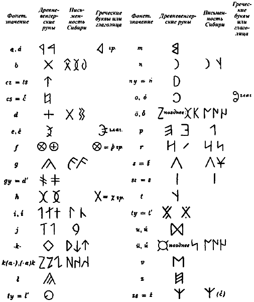 Рис. 178. Рунические знаки древневенгерского языка в сравнении с древнетюркскими рунами, греческими буквами и глаголицей.
