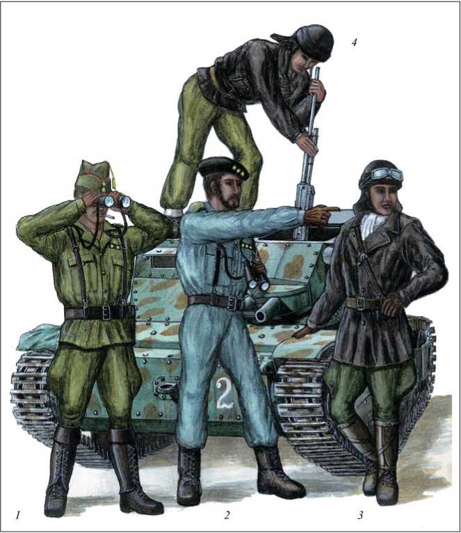 4 — испанский механик-водитель в полевой форме, кожаной куртке и итальянском танковом шлеме с пулеметом «FIAT-35».