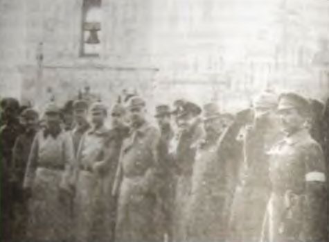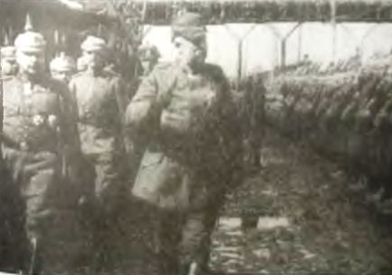 Генерал-фельдмаршал Эйхгорн по прибытии в Киев осматривает на вокзале почетный караул синежупанников (весна 1913-го)