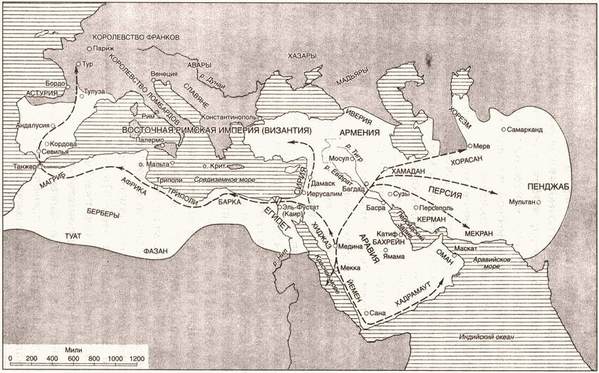 Даже несмотря на такую внушительную преграду, как Пиренеи, слишком велик был соблазн проникнуть из Испании дальше на север на земли Галлии. Впрочем, закрепиться там арабам не удалось. В 718 г. они преодолели горы и победным маршем прошли до самого Тура на северо-западе Франции, где их остановила армия франков под командованием Карла, позднее получившего прозвище Мартелл, то есть «молот». Был 732 г., прошло столетие со дня смерти пророка. Место и дата служат поводом для размышлений. Через сто лет после смерти арабского пророка его последователи сумели создать империю, которая простиралась от Атлантики до Средней Азии, иными словами, размерами превосходила Римскую. И на всей этой необъятной территории пять раз в день с минаретов звучало имя Аллаха и его пророка, а слово его преемника в Дамаске было законом.