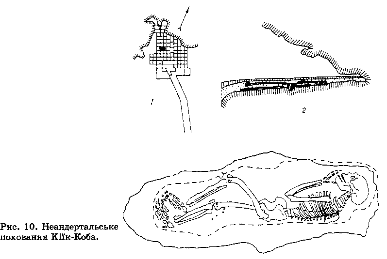 Найбільш виразні знахідки палеолітичних людей в Україні пов’язані з неандертальськими похованнями в Криму. Як уже згадувалось, 1924 р. Г. А. Бонч-Осмоловським було виявлено перші рештки неандертальців у гроті Кіїк-Коба. Поховання у печері було сильно порушено. В анатомічному порядку лежали лише права гомілка і обидві ступні; зуб і залишки кисті містилися на відстані. Поблизу було виявлено надзвичайно фрагментований кістяк немовляти.