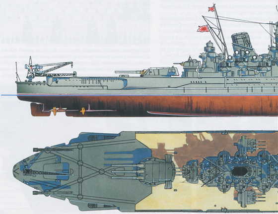 Проектирование сверхлинкора — самого большого и мощного корабля Второй мировой войны — началось еще в 1934 году. Японцы сразу решили не пролонгировать соглашения об ограничении размеров линейных кораблей, и водоизмещение «восьмого чуда света» предполагалось равным 60–69 тыс. т — почти в два раза больше вашингтонского лимита! В течение трех лет специалисты тщательно и в полном секрете анализировали достоинства и недостатки 23 вариантов вооружения, бронирования и компоновки. Начатая в конце 1937 года постройка потребовала сосредоточения всех усилий промышленности и… полиции. Открытый слип в Нагасаки, на котором собирали однотипный «Мусаси», обнесли почти трехкилометровым забором из циновок и сетей; то же пришлось сделать и в Курэ, где бдительные контрразведчики установили, что «Ямато» можно будет рассмотреть с вершины ближайшей горы. Для перевозки колоссальных башен главного калибра, весом с самый большой эсминец (свыше 2600 т каждая), пришлось построить специальное судно «Касино». Что же говорить о тяжелых кранах и большом количестве уникального оборудования, специально созданного для постройки новых линкоров!