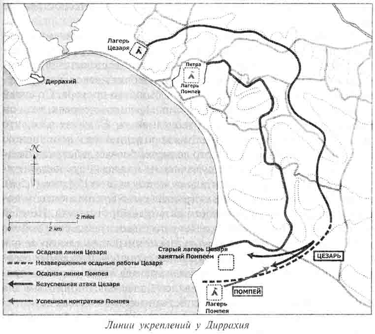 Атака завершилась чувствительной неудачей. Цезарь потерял 960 легионеров, 32 трибуна и центуриона и ряд других старших командиров. Помпеянцы захватили 32 штандарта в знак своего успеха, а также взяли довольно много пленных. Тем не менее Помпей довольствовался отражением атаки и не предпринял попытку напасть на укрепления Цезаря. По широко распространенному мнению, это было ошибкой, так как его солдаты были преисполнены боевого духа, а сторонники Цезаря оказались совершенно деморализованными. Сам Цезарь признавал, что противники «одержали бы сегодня победу, если бы только ими командовал победитель»[81]. После боя Лабиэн попросил, чтобы ему предоставили право распорядиться судьбой попавших в плен легионеров, и, насмешливо называя их «соратниками», казнил всех на виду у противника. На следующий день Цезарь построил своих солдат и обратился к ним так же, как и после осады Герговии. Он напомнил об этой предыдущей неудаче[82], за которой последовала решительная победа. Он говорил о том, как много они уже достигли, сражаясь с превосходящей армией Помпея, и убеждал их отомстить за вчерашнее поражение в следующем бою. Его укоры были мягкими, как и наказания; он довольствовался разжалованием нескольких орлоносцев. Солдаты с энтузиазмом откликнулись на его призыв, и некоторые командиры даже просили его дать новое сражение. Цезарь не испытывал уверенности в том, что его легионеры успели оправиться после поражения, а также понимал, что Помпей вовсе не обязательно примет вызов. Теперь было ясно, что попытка блокировать армию Помпея провалилась. Противник захватил один конец обводной линии укреплений, и у Цезаря не хватало сил и средств, чтобы соорудить новую, еще более длинную линию и снова замкнуть кольцо. Теперь армия Помпея могла дополнять морские поставки фуражировкой на местности. Цезарь понимал, что не достиг своей цели, но он не кривил душой, когда говорил солдатам о своей решимости победно завершить кампанию. Он выбрал отступление и ночью отправил один легион в качестве эскорта для обоза с ранеными, направлявшегося в Аполлонию. За час до рассвета он двинулся следом с остальной армией, кроме двух легионов, которые образовали арьергард и остались на линии укреплений. Утром эти легионы, как обычно, протрубили сигнал побудки. Противник так и не распознал обман, и арьергард вскоре смог последовать за главной армией. Узнав о случившемся, Помпей направил конницу в погоню, но она была задержана конным отрядом Цезаря при поддержке 400 легионеров, выстроившихся в боевой порядок. После нескольких стычек армии разошлись, так как Помпей решил пока что не преследовать Цезаря [20].