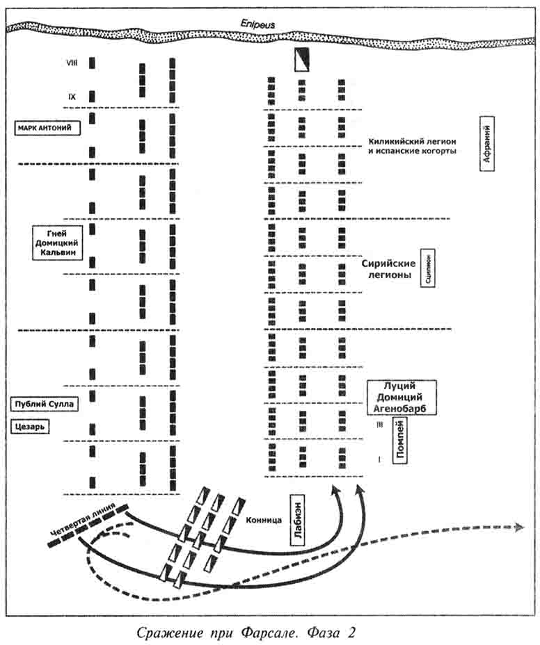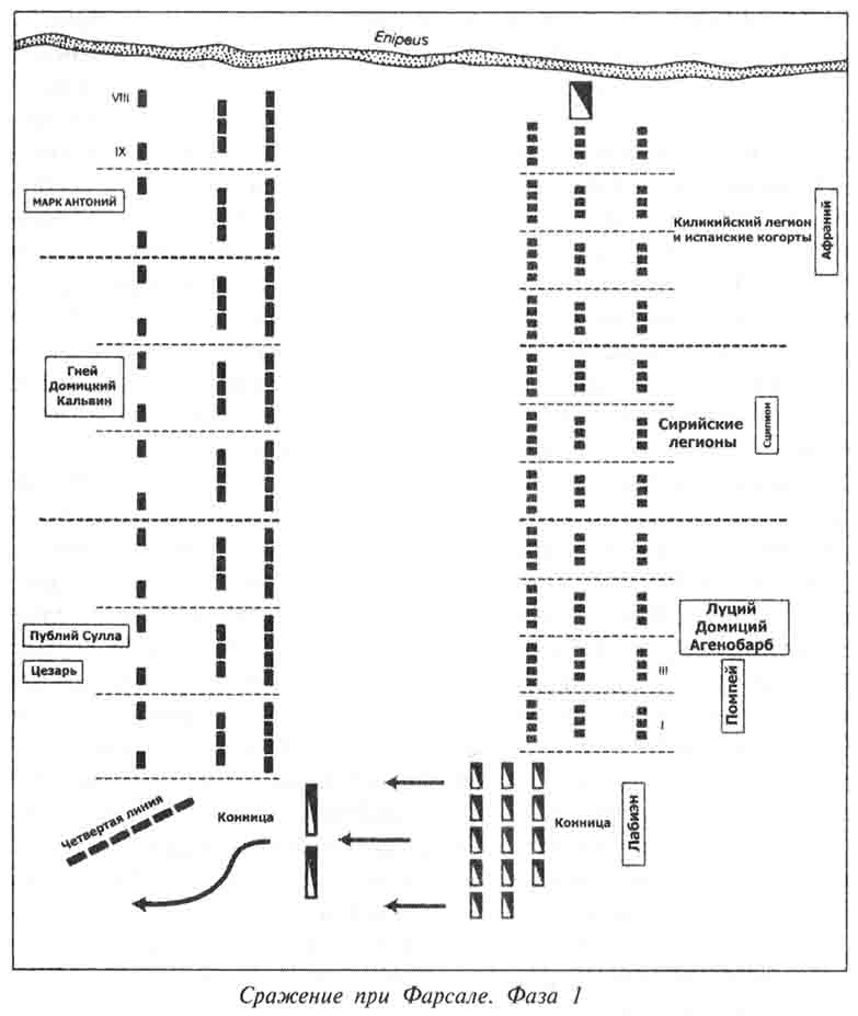 Цезарь построил свою армию, оставив реку на левом фланге. Он располагал 80 когортами, но их численность была гораздо меньше, чем в легионах Помпея, и в целом составляла не более 22 000 человек. Обе стороны оставили дополнительные подразделения для охраны своих лагерей (Цезарь оставил семь когорт). Легионы Цезаря выстроились в три линии, точно так же, как и противник, но по необходимости когорты стояли в менее плотном строю глубиной от четырех до шести рядов[83]. Как и Помпей, Цезарь выставил на флангах лучшие легионы. Десятый легион находился справа, на самом почетном месте, а левый фланг удерживало объединенное формирование, состоявшее из Девятого легиона, понесшего особенно тяжелые потери при Диррахии, при поддержке Восьмого легиона. Марк Антоний получил командование над левым флангом. Гней Домиций Кальвин командовал центром, а Публий Сулла правым флангом. Последнее назначение в некотором отношении было формальным, так как сам Цезарь выбрал наблюдательный пункт рядом с Десятым легионом и оставался на правом фланге до конца сражения, правильно угадав, что главные тактические маневры произойдут в этом секторе. Он имел только тысячу всадников и расположил их рядом с Десятым легионом лицом к массе вражеской конницы на левом фланге Помпея. План Помпея не вызывал сомнений, так как большая масса конницы явно не была предназначена для оборонительных действий. В качестве ответной меры Цезарь взял шесть когорт из третьей линии своей армии и поставил их за правым флангом, образовав короткую четвертую линию, расположенную под косым углом. Закрытая от глаз врага конными воинами, стоявшими перед ними, и также, без сомнения, замаскированная облаками пыли, поднимаемыми большим количеством движущихся людей и лошадей, эта линия осталась не замеченной для противника [25].