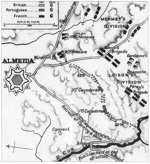 Когда испанская крепость Сьюдад-Родриго наконец сдалась, Массена приказал Нею вытеснить Крауфорда из занимаемой им зоны. Заметив активизацию противника, Крауфорд отступил на новые позиции перед рекой Коа, опираясь одним своим флангом на Альмейду. Артур Уэлльсли, ставший 26 августа 1809 г. виконтом Веллингтоном, убеждал генерала Крауфорда без боя отойти за реку, но тот зачем-то решил держаться на правом берегу, пока хватит сил. Позиция, которую он выбрал, была откровенно плохой.