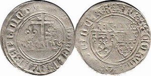Монета: большой бланк (Grand Blanc. Генриха VI, отчеканенный в Маконе. Аверс: геральдические щит Франции и Англии; реверс: крест с геральдической лилией и геральдическим львом