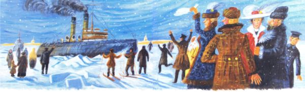 И вот наконец-то показался Кронштадт! На набережной собрался почти весь город, а многие — кто пешком, кто на лыжах, кто на санях — двинулись навстречу ледоколу. «Ермак», как на параде, торжественно вошел в замёрзшую гавань Кронштадта, сокрушая непроходимый ранее лёд.