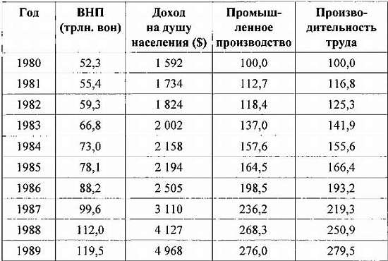 Однако в 1980-х годах объем промышленного производства в целом существенно вырос. Если мы примем уровень 1980 г. за 100 %, то показатель 1989 г. был равен 276 (см. Таблицу 14). Это стало основой для роста ВНП с 52 до 120 триллионов вон, а доходов на душу населения — с 1592 до 4968 долларов.