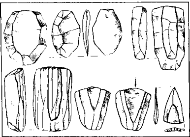 Основу ее составляет идея отделения от ядрища-нуклеуса заготовки — пластины или отщепа заранее заданной формы. Просто? Конечно, просто! Но ведь прошли сотни тысяч лет, прежде чем древний человек смог моделировать в своем сознании конечный результат всего процесса обработки камня. Это было революционизирующим действием. Прав В. П. Любин, указывавший, что именно техника леваллуа привела первобытных мастеров к идее призматического нуклеуса, а вместе с появлением последнего и к отделению тонких ножевидных пластин, на которых базируется техника расщепления камня следующего, завершающего этапа — позднего палеолита.