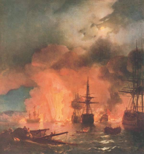 И. Айвазовский. «Чесменский бой» Перед началом сражения соотношение сил между турецким и русским флотами было не в пользу последнего, т. е. турецкая эскадра состояла из 16 линейных кораблей, 6 фрегатов, 50 вспомогательных судов с общим количеством орудий, равнявшимся 1430 единицам. В то же время русские обладали 9 линейными кораблями, 3 фрегатами, 1 бомбардирским кораблем и 17 вспомогательными судами с общим вооружением в 820 орудий. Перевес турецких сил был больше почти вдвое. Турецкие корабли, стоявшие неподалеку от берега, выстроились в две дугообразные линии. Расстояние между судами было настолько маленьким, что вторая линия не могла вести артиллерийский огонь, не причиняя вреда судам, стоящим в первой линии. 24 июня, когда русские корабли сблизились с противником, граф Орлов увидел большой турецкий флот. Он испугался и растерялся. Адмирал настоятельно посоветовал Орлову атаковать немедленно. Решено было действовать следующим образом: учитывая уязвимость боевого построения кораблей и плохую подготовленность турецких экипажей, следовало поставить все линейные русские корабли в кильватерную колонну и по ветру под прямым углом подойти к противнику на предельно короткую дистанцию. После этого нужно было развернуться к туркам боком и произвести мощный артиллерийский залп по авангарду и нескольким кораблям центральной части. При этом остальные корабли, прижатые к берегу, не смогут прийти на помощь судам первой линии. Затем нужно было уничтожить все корабли второй линии.
