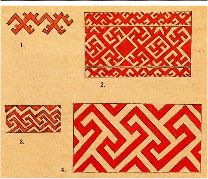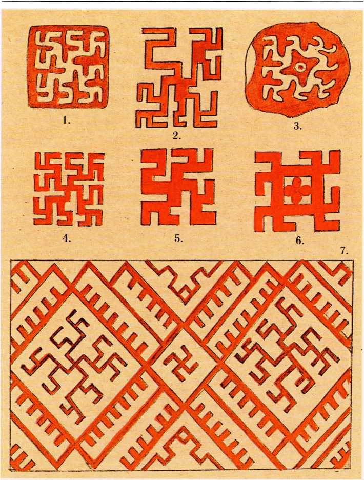 Орнамент прославянского украшения, 2 тыс. до н. э. 3—4. Знаки на средневековой миниатюре. 16 в. Москва. 5—7. Ткачество. Вторая половина 19 в. Вологодская губ.
