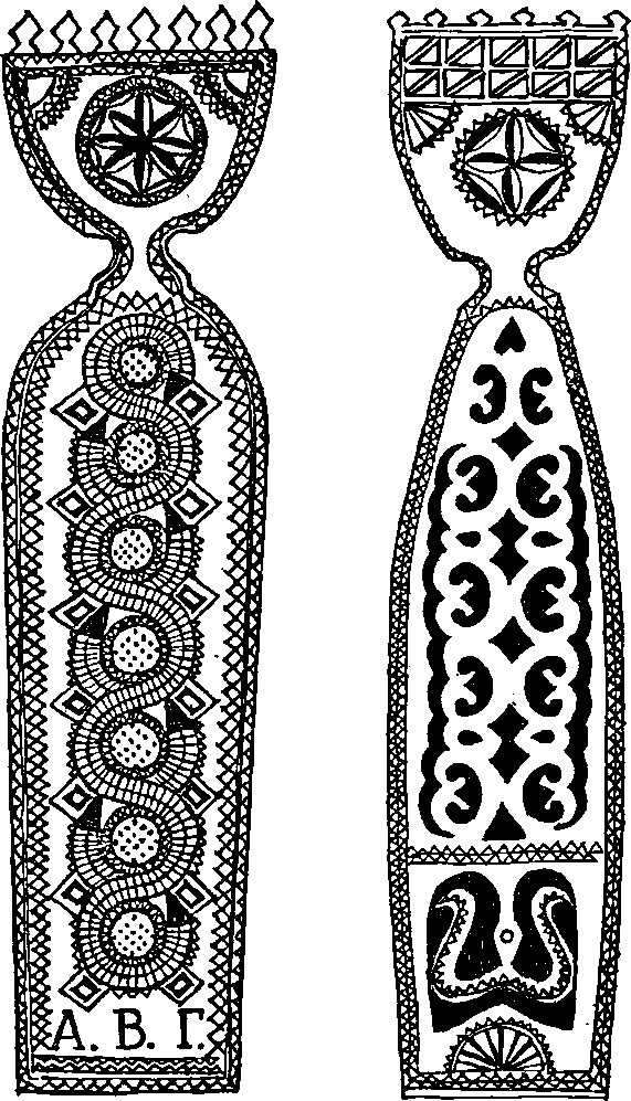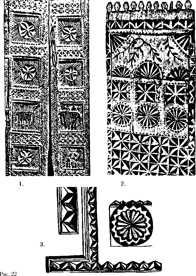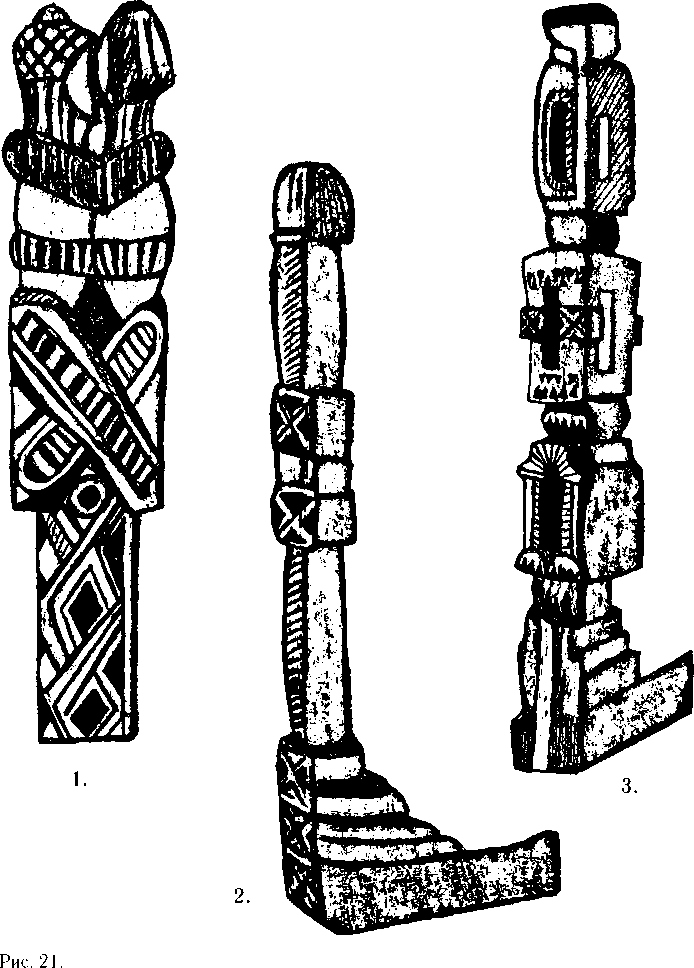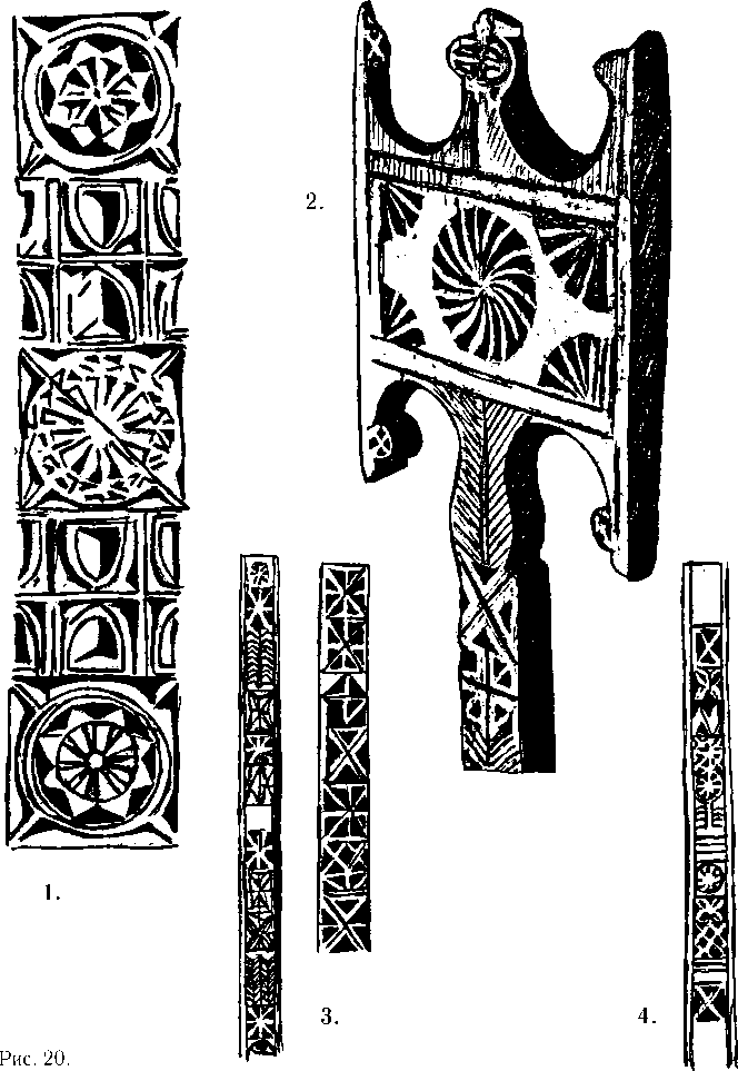 1. XIX в. Афганистан. Гиндукуш. Резной деревянный столб. 2—3. XIX в. Швейки. Вологодская губ.