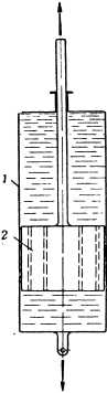 Рис. 127. Схема устройства гидравлического амортизатора двухстороннего действия: 1 — корпус амортизатора; 2 — поршень.