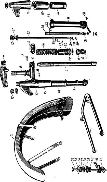 Рис. 129. Передняя вилка мотоцикла М-72: 1 — подставка переднего колеса; 2 — грязевой щиток переднего колеса; 3 — труба вилки; 4 — верхний мостик; 5 — нижний мостик; 6 — стержень вилки; 7 — правый наконечник вилки; 8 — левый наконечник вилки; 9 — верхняя втулка; 20 — нижняя втулка; 11 — замочное кольцо нижней втулки; 12 — гайки крепления труб вилки; 13 — зажимные болты нижнего мостика; 14 — нижние кожухи подвижной части вилки; 15 — нижние кожухи неподвижной части вилки; 16 — верхний кожух (левый); 17 — верхний кожух (правый); 18 — пружины передней вилки; 19 — верхние наконечники пружин вилки; 20 — нижние наконечники пружин вилки; 21 — накидные гайки крепления нижних наконечников пружин вилки; 22 — сальники; 23 — стержни амортизатора; 24 — обратные клапаны (поршни) амортизатора; 25 — трубки амортизатора; 26 — втулка стержня амортизатора; 27 — контргайки крепления стержней амортизатора; 28 — направляющие стержня амортизатора; 29 — нижние гайки стержней амортизатора; 30 — ограничительные штифты обратных клапанов амортизатора; 31 — заглушки трубок амортизатора; 32 — пружинные замочные кольца втулок амортизатора; 33 — винт для спуска масла; 34 — регулировочный болт рулевого амортизатора; 35 — шариковые фиксаторы рулевого амортизатора; 36 — крестообразная пружина рулевого амортизатора; 37 — упорные шайбы пружины рулевого амортизатора; 38 — гайки крепления верхнего мостика вилки; 39 — гайка крепления верхнего шарикоподшипника стержня передней вилки; 40 — шариковые подшипники стержня передней вилки; 41 — неподвижная пластина рулевого амортизатора; 42 — подвижная пластина рулевого амортизатора; 43 — упорный штифт подвижной пластины рулевого амортизатора; 44 — проушины крепления стоек щитка переднего колеса.