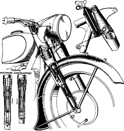 При наезде колеса на неровность дороги пружина передней вилки сжимается. Пройдя препятствие, сжатая пружина распрямляется, отбрасывая колесо вместе с вилкой к дороге. При ударе о дорогу колесо снова подскакивает, пружина сжимается, а затем, разжавшись, опять отбрасывает колесо назад. Эти колебания прекращаются весьма медленно, так как внутреннее сопротивление деталей вилки незначительно. Такие колебания можно было бы устранить, если поставить пружину большей жесткости и с меньшим периодом колебаний. Но в этом случае вилка стала бы более жесткой и более резко передавала бы толчки, возникающие от неровностей дороги. Поэтому для уменьшения колебаний вилки применяются гасители (амортизаторы) продольных колебаний.