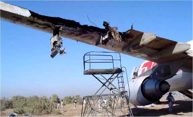 ФОТО 6. 22 ноября 2003 г. Транспортный Airbus A300B4-203F компании DHL после возвращения в аэропорт Багдада (Ирак) с поврежденным, горящим левым крылом (поражен топливный бак) после попадания ракеты ПЗРК. Экипаж благополучно посадил самолет, жертв не было //www.state.gov/t/pm/rls/fs/169139.htm