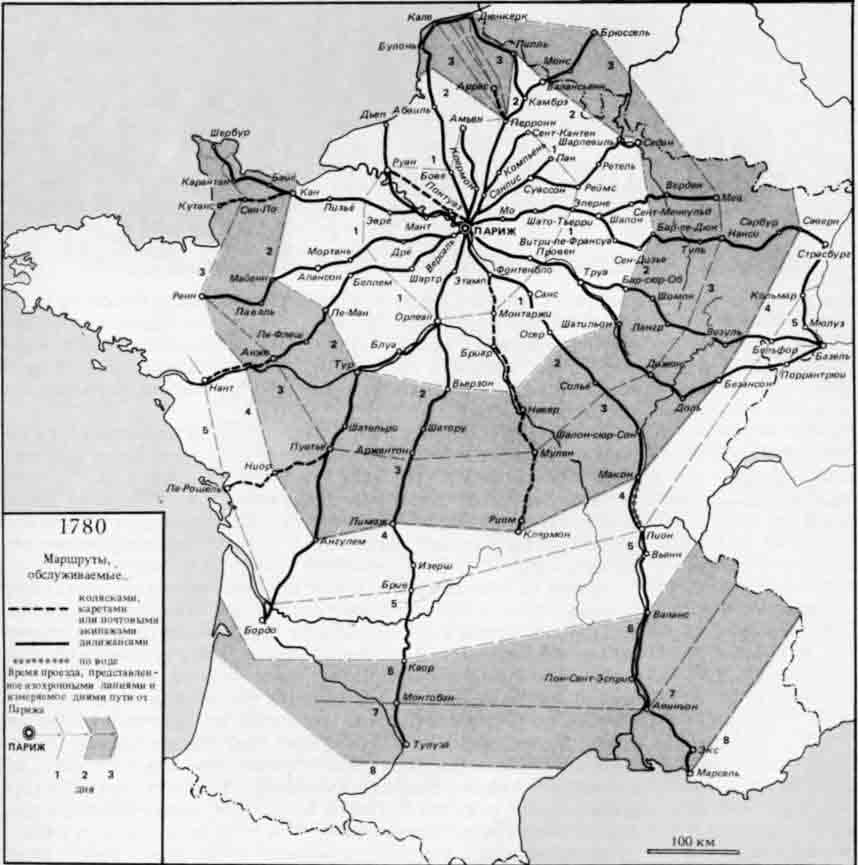 Эти две карты Арбелло (Arbellot G.) (см.: «Annales E. S. С.», 1973, p. 790, вклейка) показывают «великий дорожный сдвиг», который за счет новых дорог, обустроенных для экипажей, мчащихся во весь дух, сделавшегося всеобщим использования карет-«тюрготин» и увеличения числа почтовых станций сократил в период 1765–1780 гг., иной раз вдвое, расстояния по всей Франции. В 1765 г. требовалось самое малое три недели, чтобы добраться из Лилля до Пиренеев или из Страсбурга в Бретань. Даже в 1780 г. Франция предстает как компактное пространство, пересечь которое можно лишь медленно. Но прогресс дорог обнаруживал тенденцию к охвату всего королевства. В самом деле, на первой карте можно различить несколько «привилегированных» направлений: Париж — Руан или Париж — Перонн (дорога занимала день, т. е. столько же, сколько из Парижа в Мелён); Париж — Лион (5 дней, т. е. столько же, сколько из Парижа в Шарлевиль, или в Кан, или в Витри-ле-Франсуа). На второй карте расстояния и продолжительность поездок в основном совпадают (отсюда — почти концентрические круги вокруг Парижа). Продолжительность поездок по старинным привилегированным дорогам в направлении на Лион и Руан оставалась такой же. Решающим для такого сдвига обстоятельством было создание Тюрго в 1775 г. Государственной службы почтово-пассажирских перевозок.