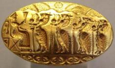 На кольце изображен ритуал приношения – сосуды с вином, которые переодетые в ослов (или каких-то других животных) несут к поднявшему ритуальный кубок правителю, сидящему на троне. Подобный ритуал наверняка был изображен на фреске в Микенах, но восстановить его смысл мы вряд ли сможем