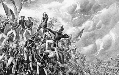 К февралю 1847 года войска Санта-Анны[15] добрались до группировки Тейлора и нанесли ей чувствительное поражение, несмотря на превосходство американцев в артиллерии. Американцы отступили, но тут Санта-Анна вдруг отпустил 400 пленных солдат США и отвел войска на исходные позиции. Затем он и вовсе бросил армию, уехав в столицу. В Мехико либералы как раз успешно подавляли мятеж консерваторов. Но Санта-Анна встал на сторону мятежников, уволил вице-президента либерала Фариаса и сразу же отменил закон о конфискации церковной собственности. В благодарность за это он получил от клерикалов 2 миллиона песо.