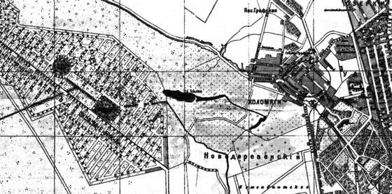 Трасса прохождения Озерковской линии Приморской железной дороги через Коломяги с обозначениями станций Коломяги и Графская