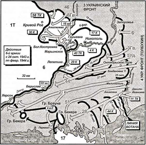Самая жестокая борьба разгорелась вокруг Мелитополя на южном фланге «линии Вотана». Советская пехота оставила горы трупов, советский 11-й танковый корпус потерял сотни Т-34. 6-я армия Холлидта снова сражалась с призраком Сталинграда — поскольку то, что Толбухин готовил дивизиям Холлидта, было Сталинградом на Днепре. По жестокости сражение у Мелитополя ни в коем случае не уступает Сталинградскому.