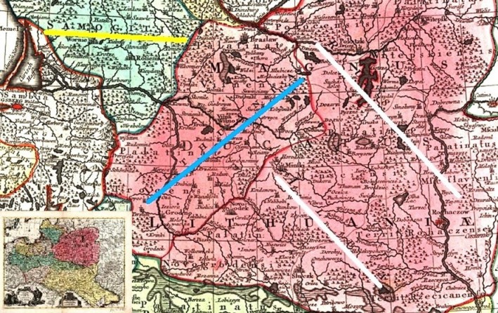 Карта Польши и ВКЛ 1759 года. Что на современных российских и прибалтийских картах обозначается как «Литва», тогда называлось Жемайтией (Samogitia, подчёркнуто жёлтым). Отдельно от Жемайтии: Литва (Lithuania, подчёркнуто синим) и «Русь Белая» (Russia Alba, подчёркнуто белым)