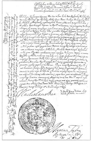 Так выглядит оригинальный документ Владислава IV на польском языке, с печатью и подписью на латыни «Wladislaus Rex» «Печать князя Корибута»