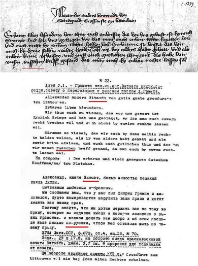 Нет и никогда не было ни одного документа, написанного ни одним великим князем литовским на языке, который называют «литовским» сейчас. Возможно, кто-то скажет, что я плохо искал? Не искал — знаю, что их нет. В поиске таких документов я доверяю усердию современных литовцев, которые не просто очень, а ОЧЕНЬ-ОЧЕНЬ хотят такие документы найти и занимаются этим уже полтора столетия.