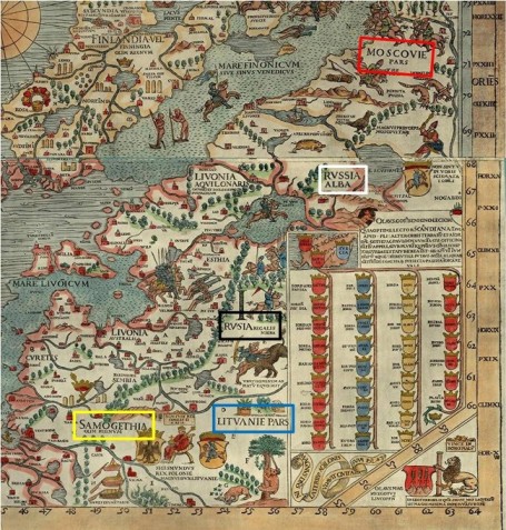 «Карта морей» 1539 года. Жемайтия — жёлтым цветом, Литва — синим, Русь Чёрная — чёрным, Русь Белая — белым, Московия — красным