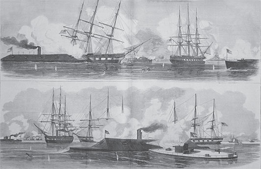 В 1862 году, во время Гражданской войны в США между Севером и Югом, состоялось и первое сражение с участием броненосцев. За северян сражался «Монитор», а за южан – «Мерримэг». Поединок закончился вничью; противники разошлись, не нанеся друг другу существенных повреждений.
